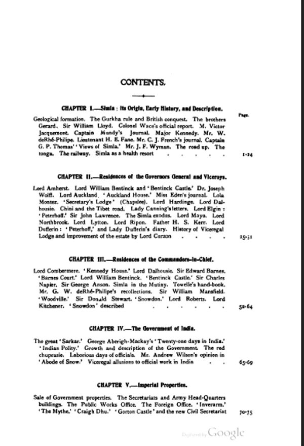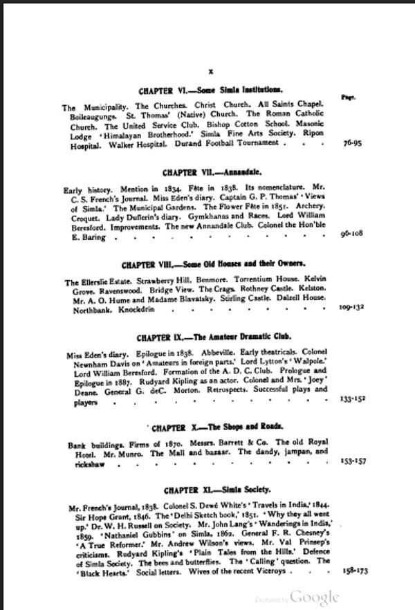 The table of contents reveals a rich tapestry of Simla’s colonial life—its institutions, homes, dramatic arts, and social circles.